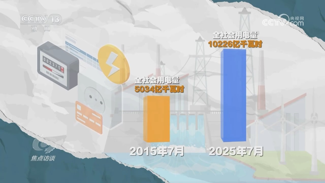 用电量一直被看作是经济的“晴雨表”,记者查询了一下十年前,也就是2015年夏天的数据,纵向一比,发现我国今年7月的用电量比十年前的7月翻了一番。这些电都用在哪儿了呢?