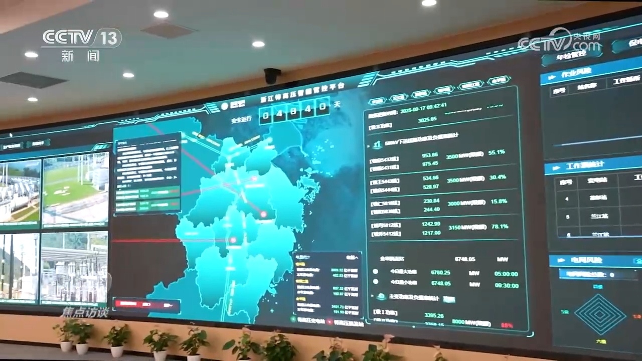 国网浙江超高压公司生产指挥中心,大屏幕上实时看到的红色和绿色的线路,正是宁夏、青海、四川等“外援”小伙伴们的电力在源源不断送到浙江。